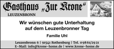 Veranstaltet wird der Leuzenbronner Tag von der Kirchengemeinde Leuzenbronn, der Landeskirchlichen Gemeinschaft Rothenburg o.d.T. und dem CVJM- Leuzenbronn/Rothenburg e.V., die sich sehr auf Euer Kommen freuen!