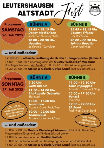 „Leutershausen“ hat wieder gemeinsam an einem Strang gezogen und so freue ich mich sehr, Sie am letzten Juli-Wochenende im Namen der Stadt und aller Mitwirkenden zum diesjährigen Altstadtfest einladen zu können! Dieses Fest ist eine wunderbare Gelegenheit, gemeinsam zu feiern, die Gemeinschaft zu stärken und die besondere Atmosphäre der schönen Altstadt Leutershausens zu genießen. Es ist wichtig, dass wir solche Momente miteinander teilen, denn sie verbinden und machen das Zusammenleben noch lebendiger.