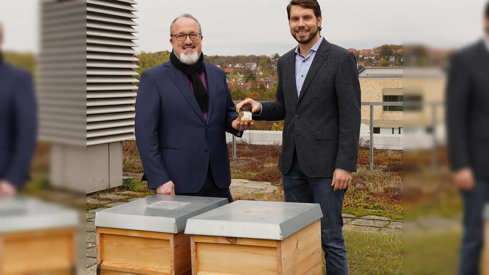 An der Hochschule Ansbach ist die erste Bienensaison mit Erfolg abgeschlossen worden, wobei 34 Kilogramm Honig geerntet wurden. Das erste Glas des selbstgewonnenen und in den Laboren der Hochschule abgefüllten Honigs wurde nun feierlich an den Hochschulpräsidenten Prof. Dr.-Ing. Sascha Müller-Feuerstein übergeben.