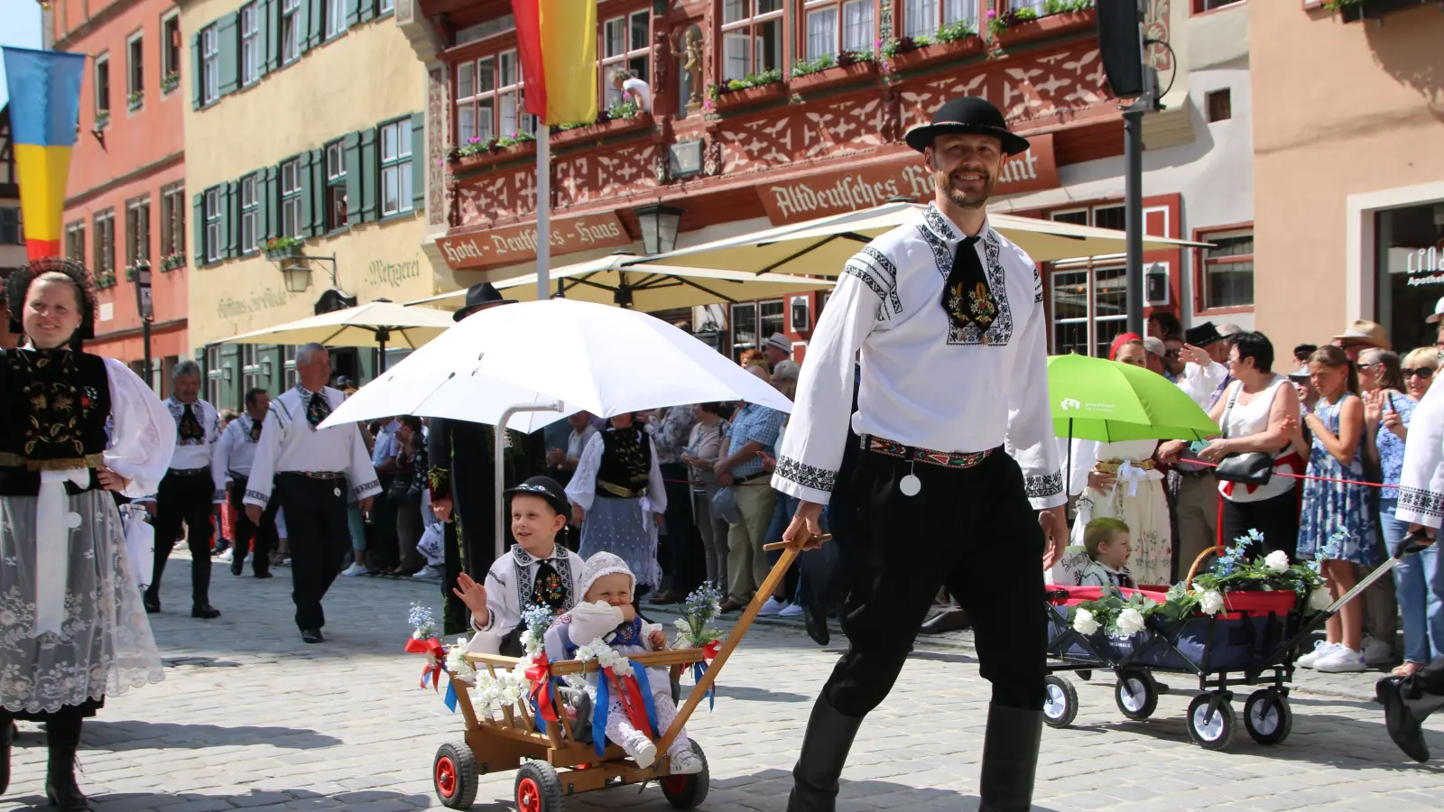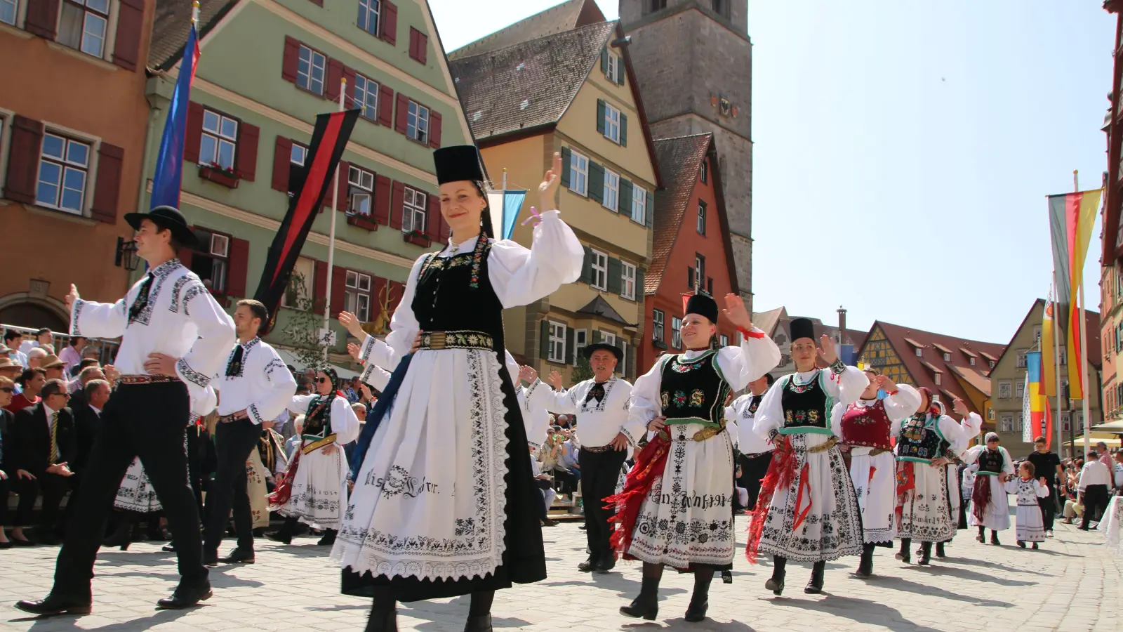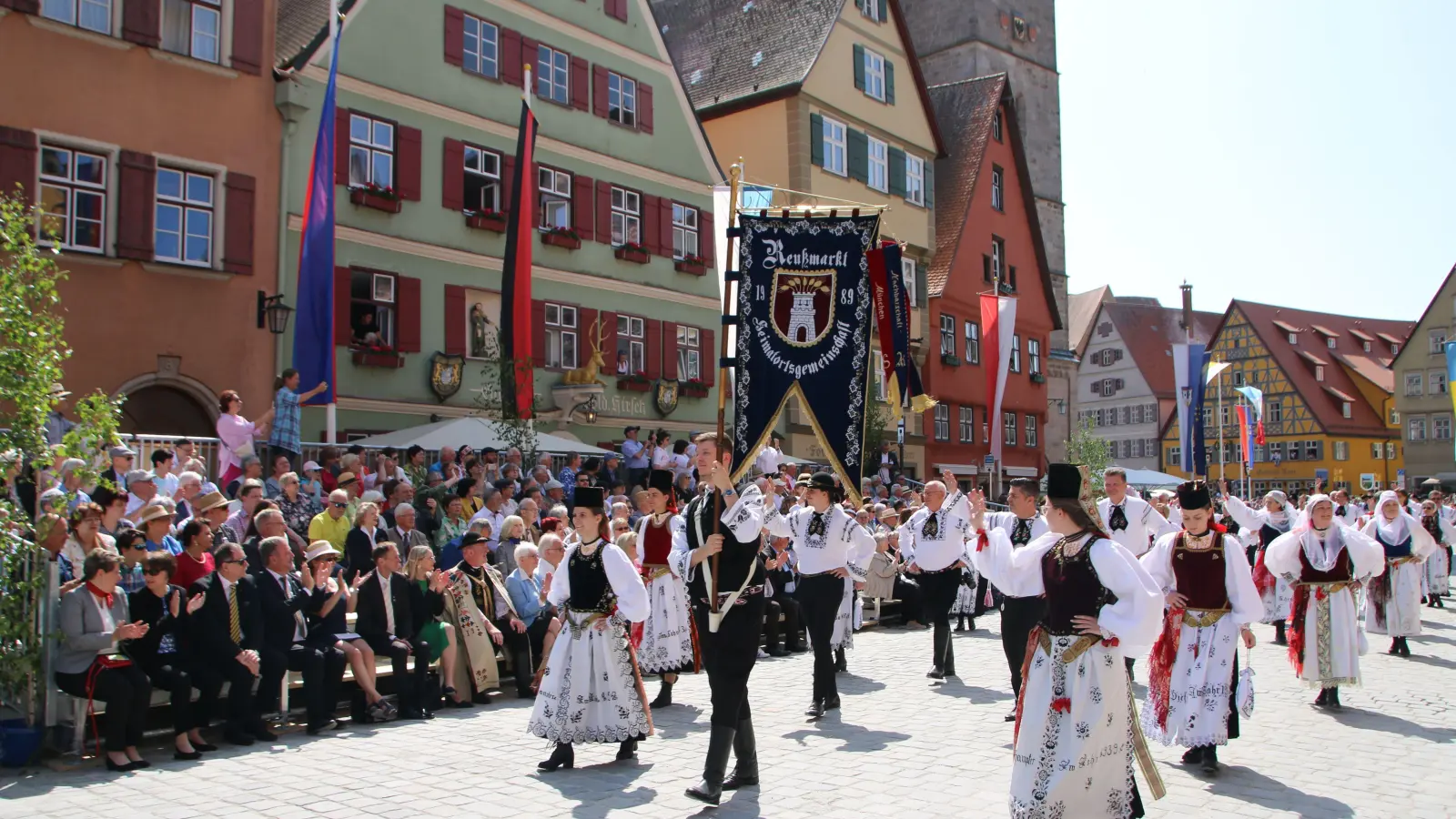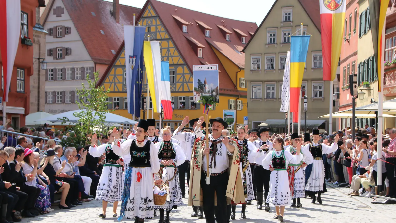 Farbenfrohe Trachten und Blumen säumten am Pfingstsonntag die Dinkelsbühler Altstadt. Beim Trachtenumzug demonstrierten 100 Gruppen mit weit über 2000 Mitwirkenden selbstbewusst siebenbürgische Tradition und Kultur. Er hat sich zum Publikumsmagnet des Heimattags der Siebenbürger Sachsen herauskristallisiert. Zum 73. Mal findet das Siebenürger-Treffen in Dinkelsbühl statt, dieses Jahr unter dem Motto „Miteinander schafft Heimat”.