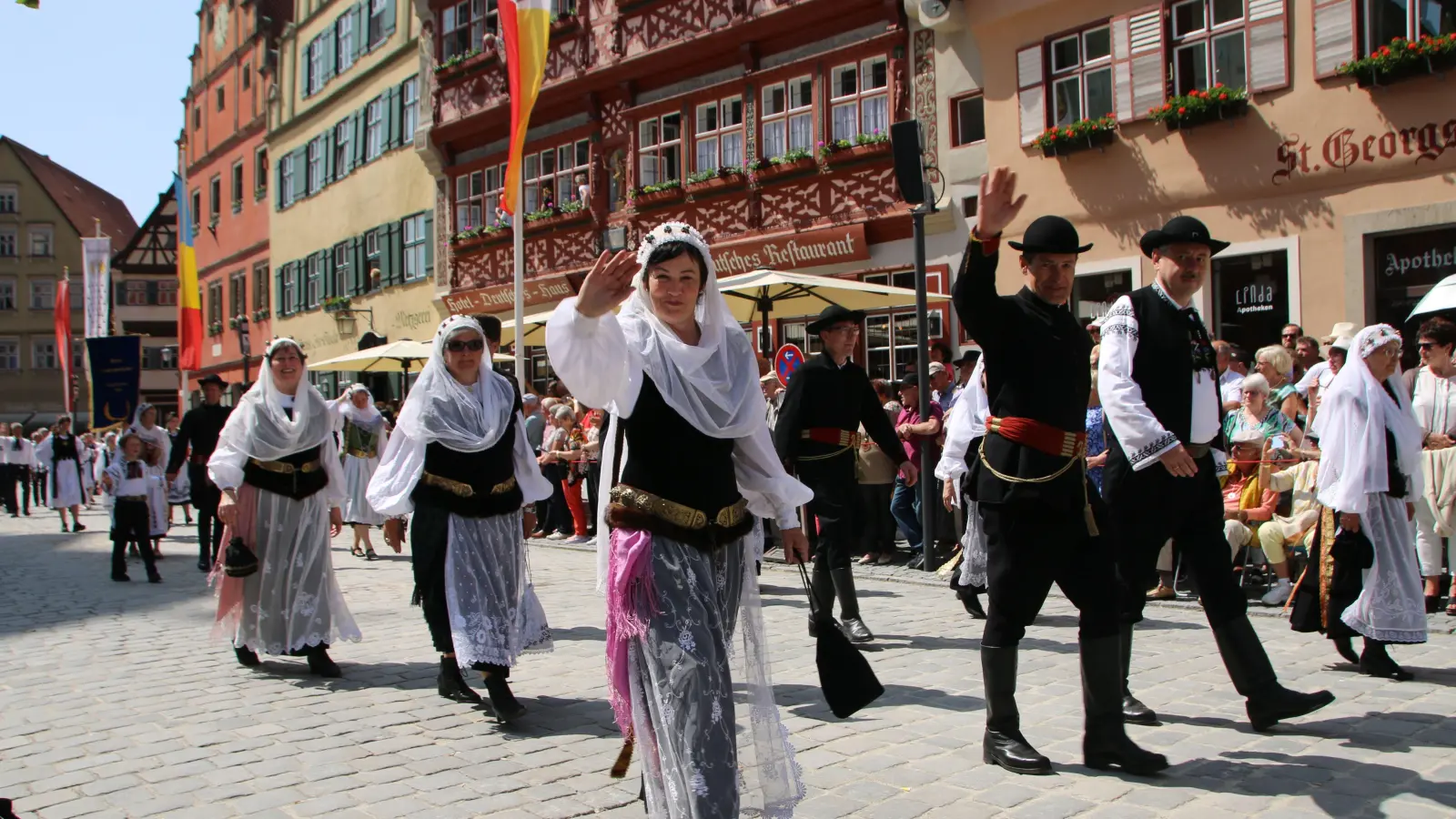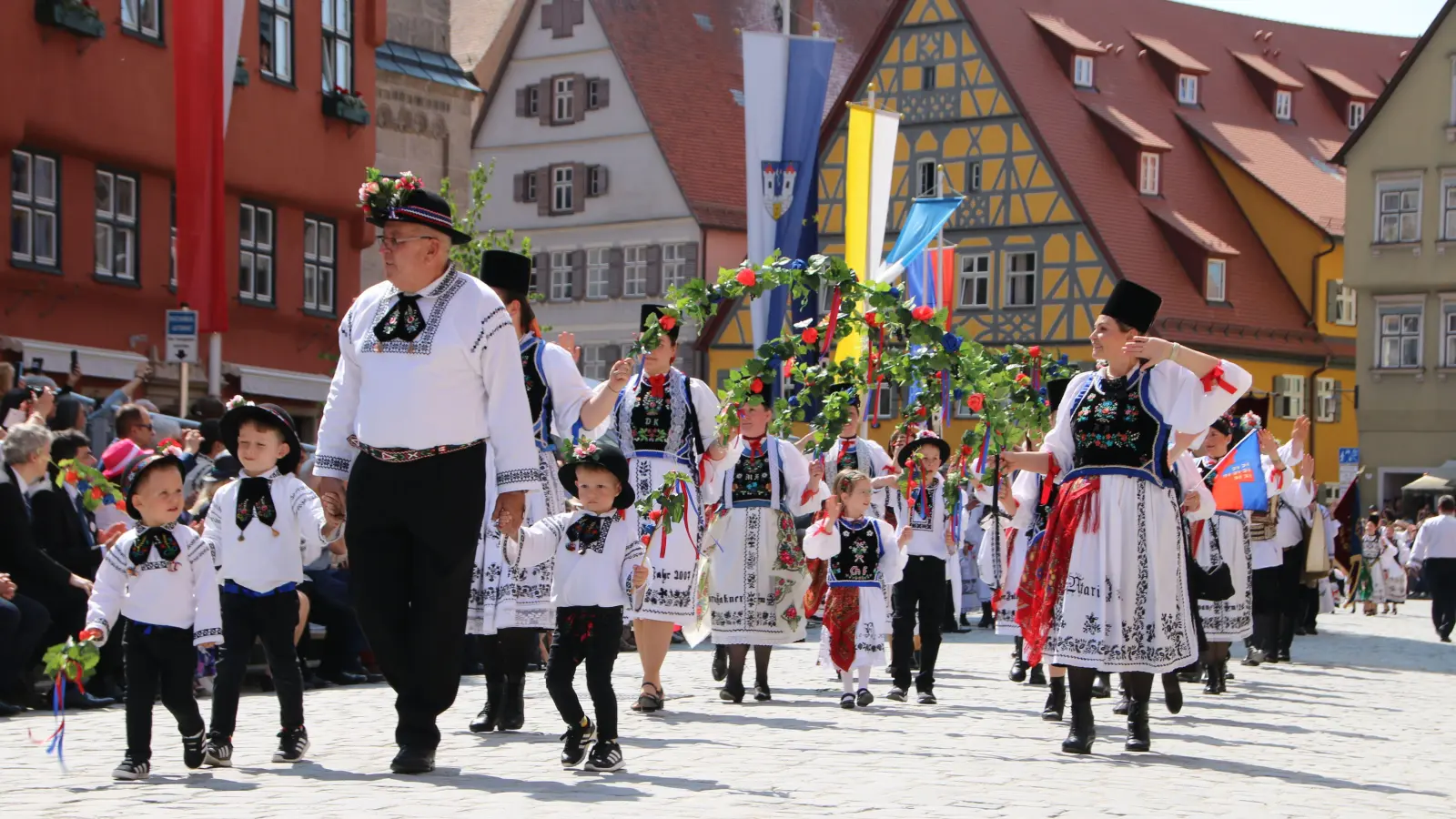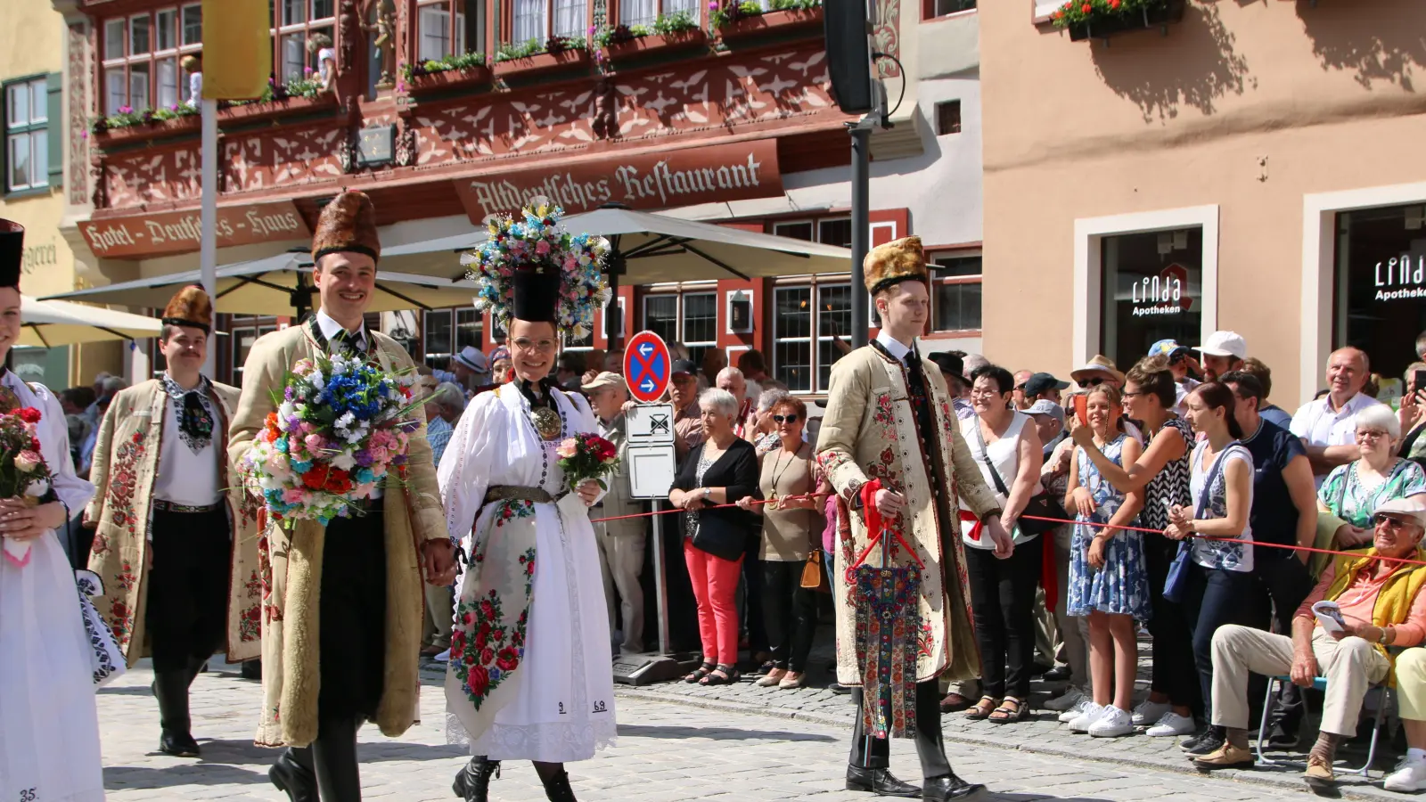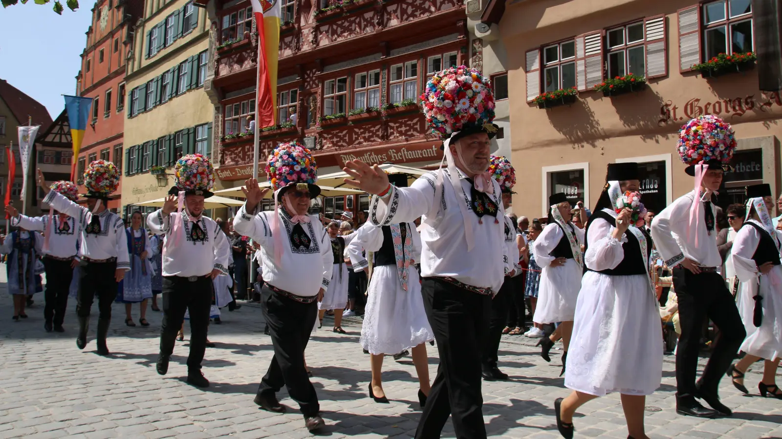 Farbenfrohe Trachten und Blumen säumten am Pfingstsonntag die Dinkelsbühler Altstadt. Beim Trachtenumzug demonstrierten 100 Gruppen mit weit über 2000 Mitwirkenden selbstbewusst siebenbürgische Tradition und Kultur. Er hat sich zum Publikumsmagnet des Heimattags der Siebenbürger Sachsen herauskristallisiert. Zum 73. Mal findet das Siebenürger-Treffen in Dinkelsbühl statt, dieses Jahr unter dem Motto „Miteinander schafft Heimat”.