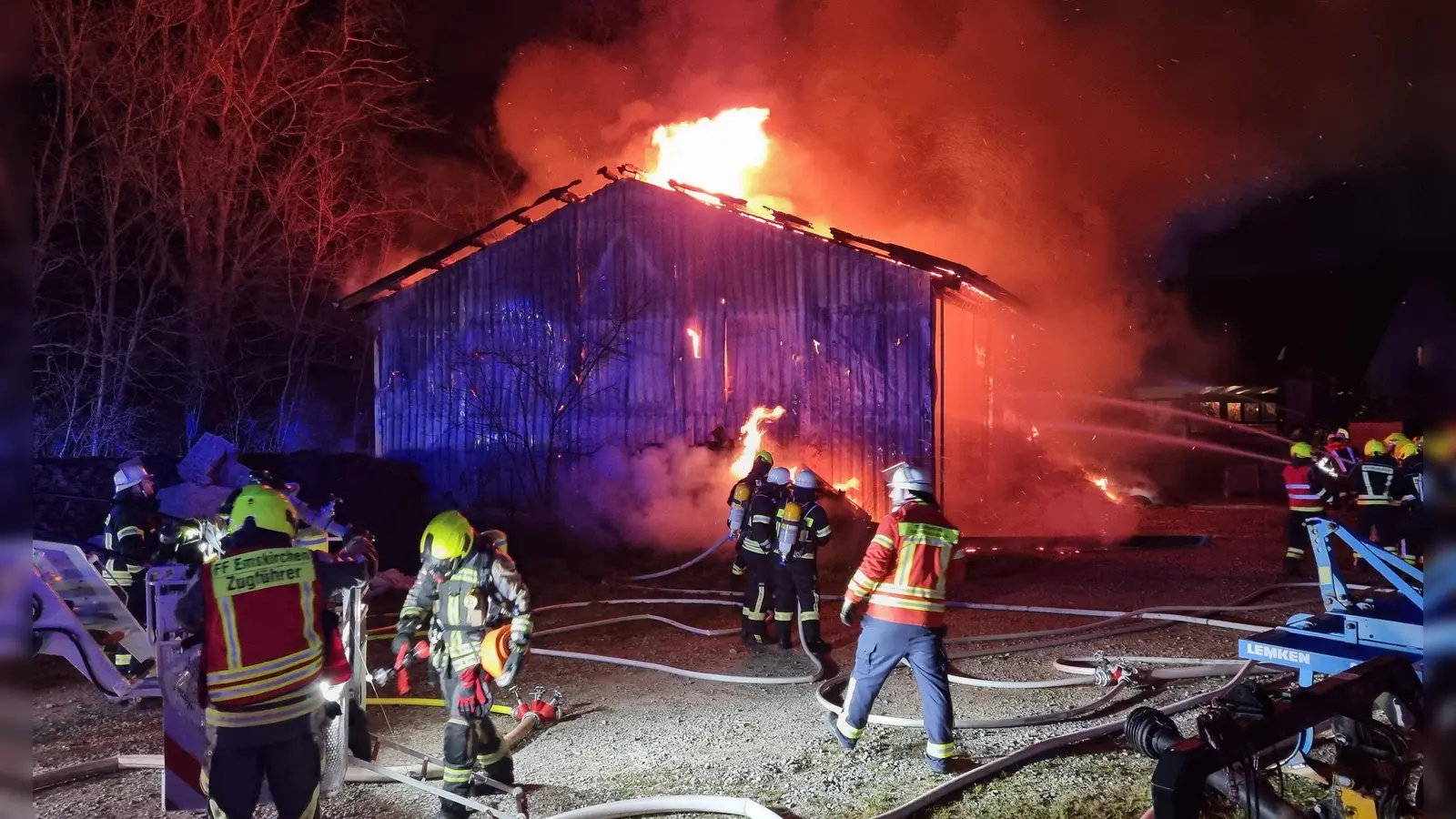Rund 110 Einsatzkräfte kämpften laut Weiskirchen bis in die Morgenstunden gegen die Flammen. Dass diese auf weitere Gebäude übergriffen, konnte verhindert werden. Mit drei Traktoren wurde das in der Scheune gelagerte Stroh und Heu auf einem Feld verteilt, wo es abgelöscht werden konnte. Ein abgestellter Mähdrescher und andere landwirtschaftliche Nutzgeräte dürften nicht mehr zu retten sein.