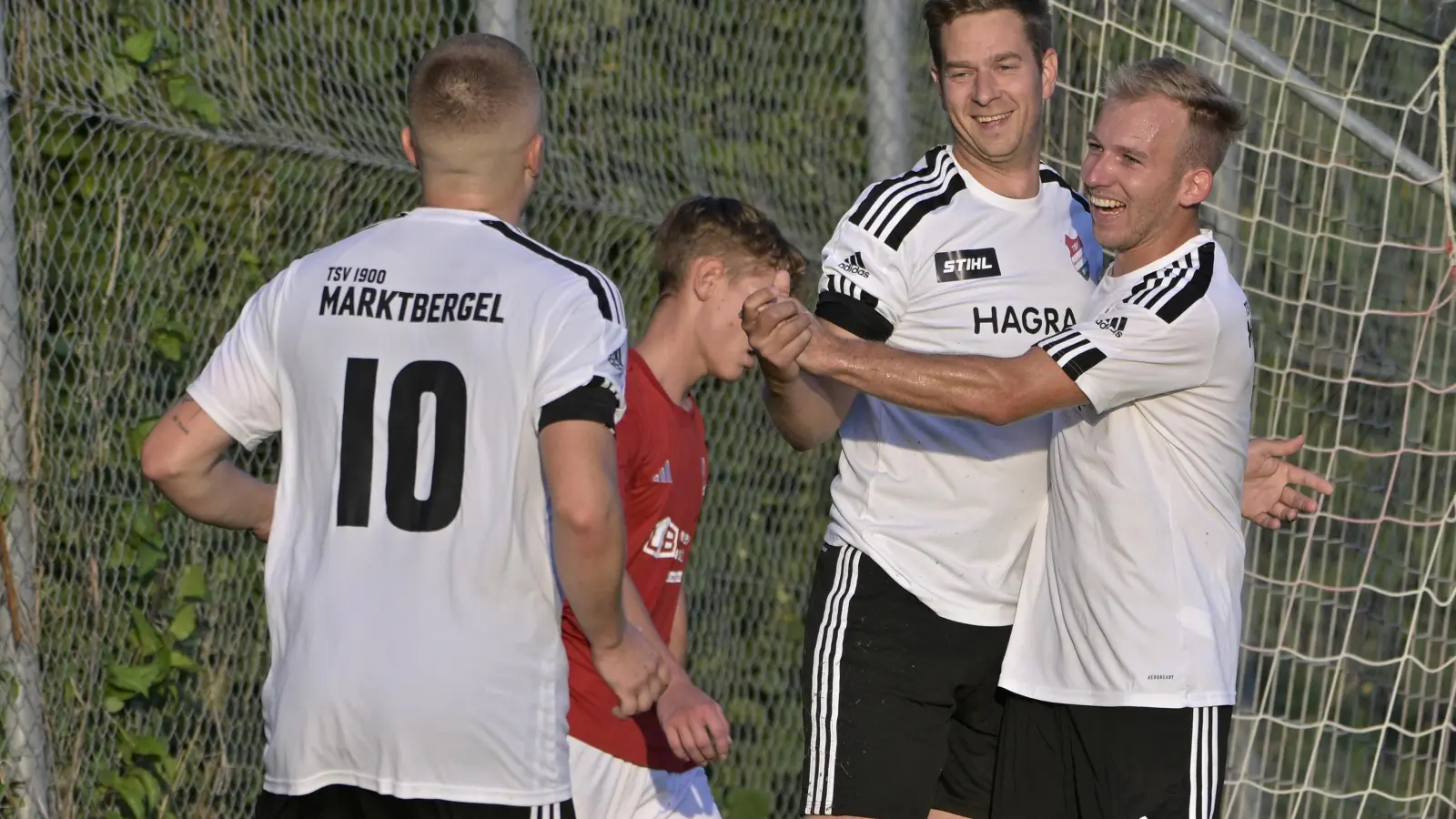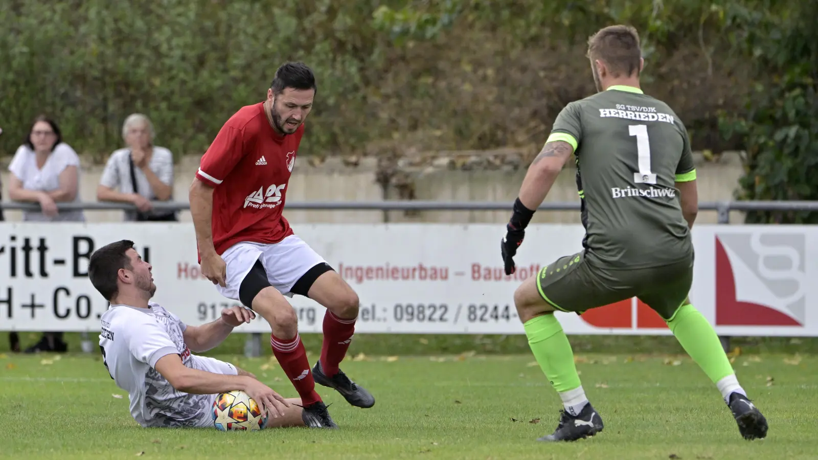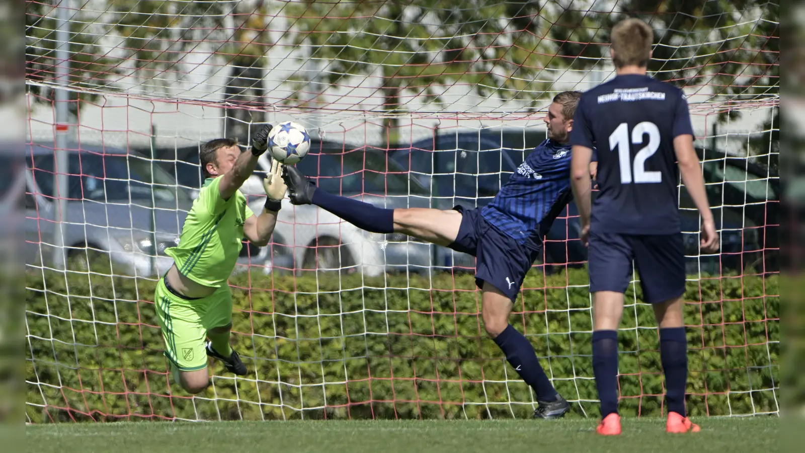 Da bläst Steinachgrunds Torwart Daniel Himmrich die Backen ganz dicke auf, den Ball fängt er trotzdem ganz locker vor dem Bucher Jens Wartenfelser (links) ab, beobachtet von SVG-Spieler Giancarlo Ramirez (Nr. 7). Die Landesliga-Partie gewann Gastgeber Steinachgrund mit 4:2. (Foto: Martin Rügner)