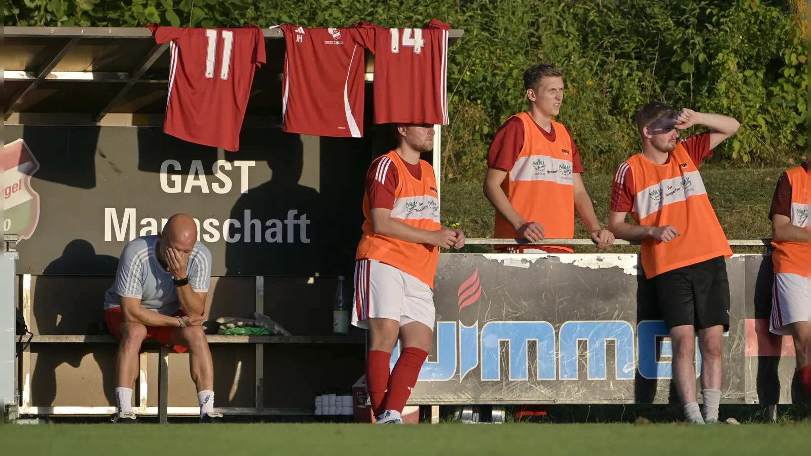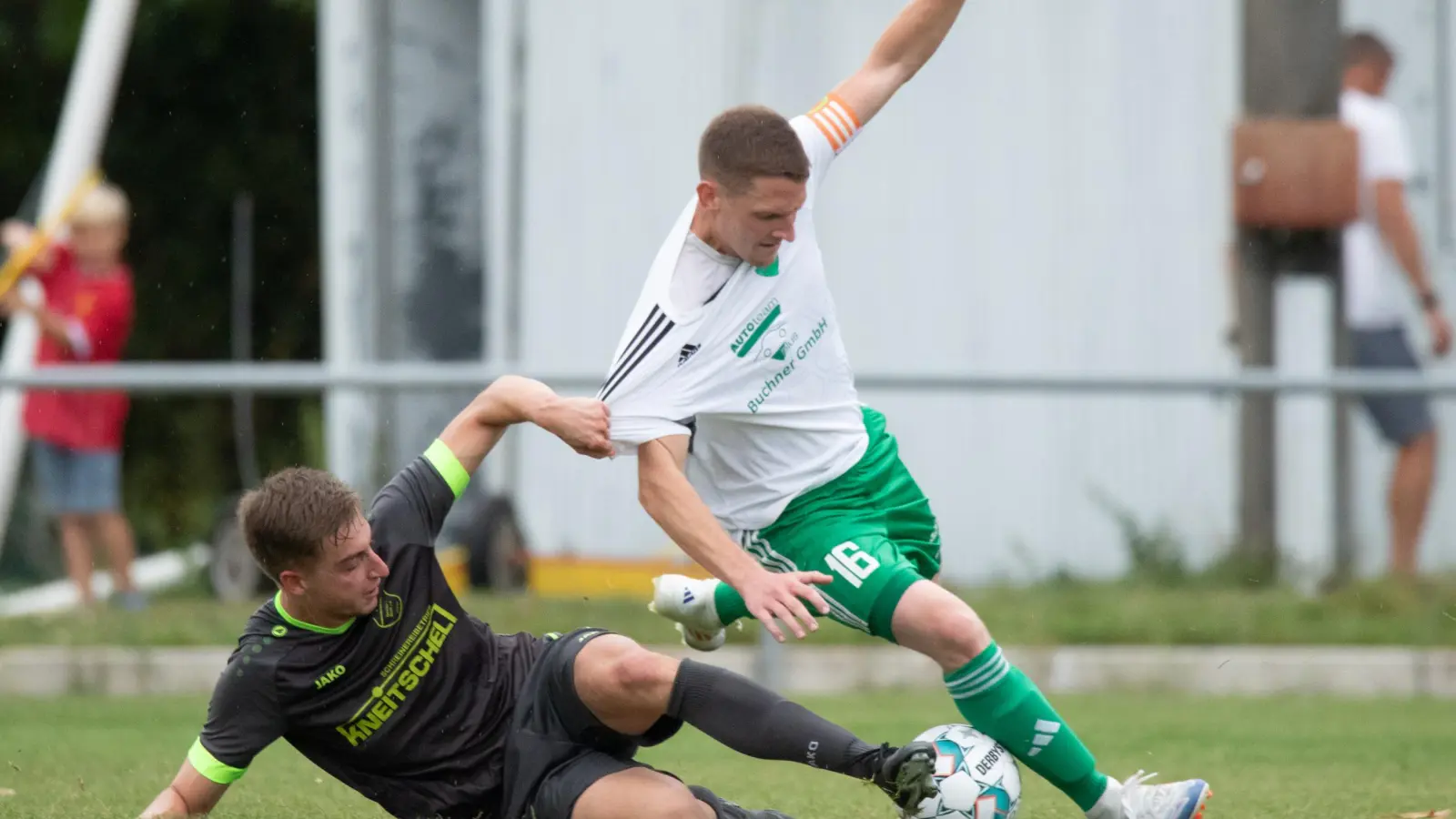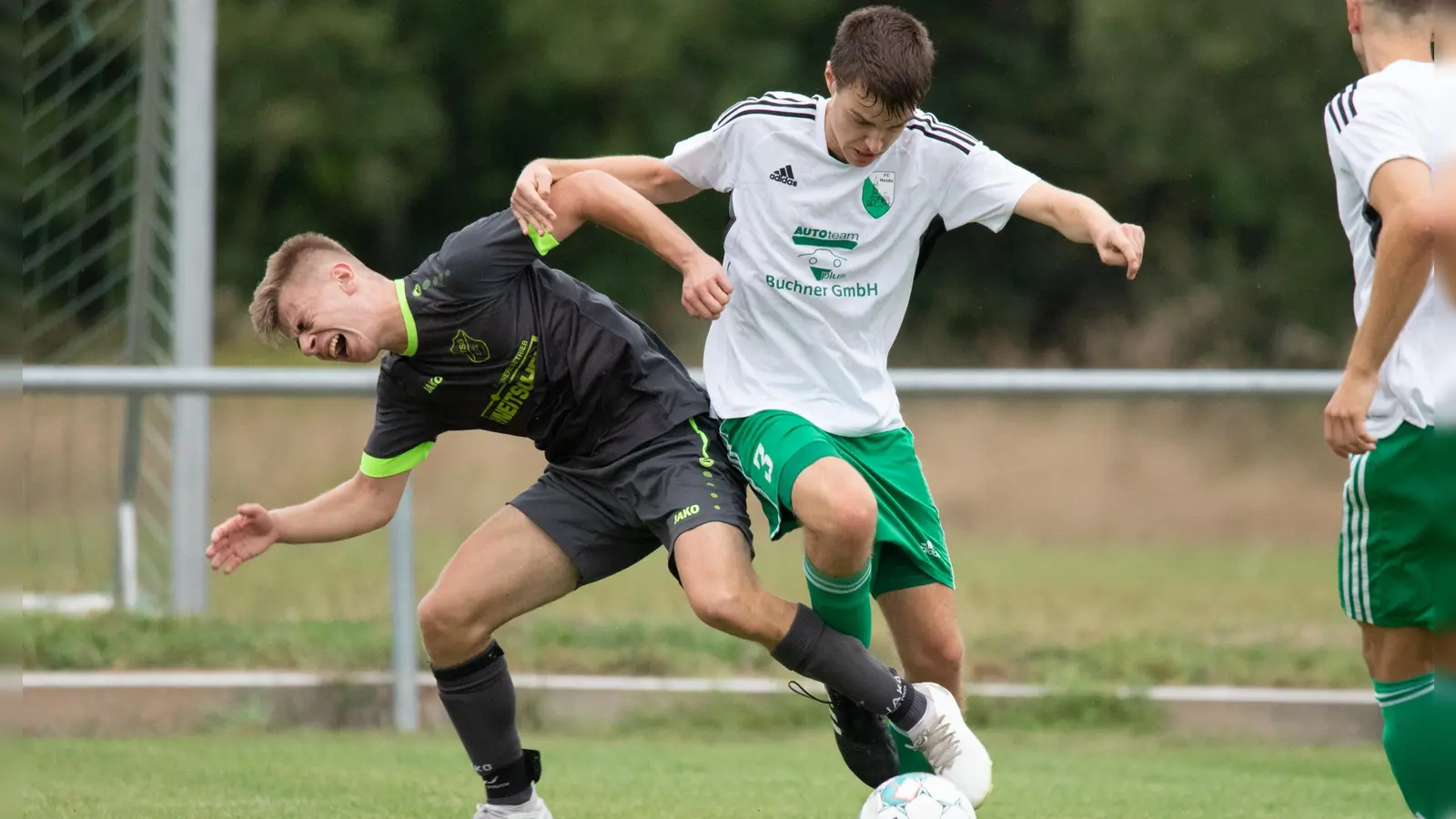 Da bläst Steinachgrunds Torwart Daniel Himmrich die Backen ganz dicke auf, den Ball fängt er trotzdem ganz locker vor dem Bucher Jens Wartenfelser (links) ab, beobachtet von SVG-Spieler Giancarlo Ramirez (Nr. 7). Die Landesliga-Partie gewann Gastgeber Steinachgrund mit 4:2. (Foto: Martin Rügner)