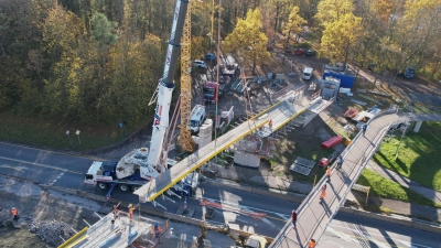 Die neue Fußgängerbrücke am Schwimmbad in Rothenburg kam „von oben”. Das 1,3 Millionen Euro teure Bauwerk wurde von einem mobilen Schwerlastkran eingehoben.
