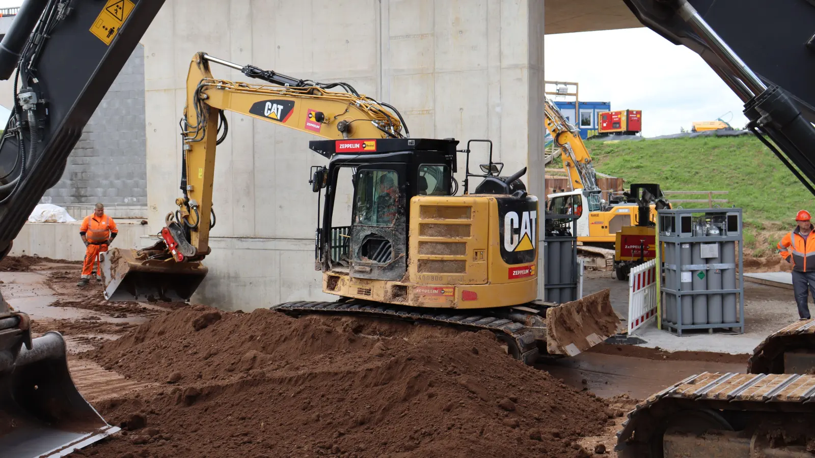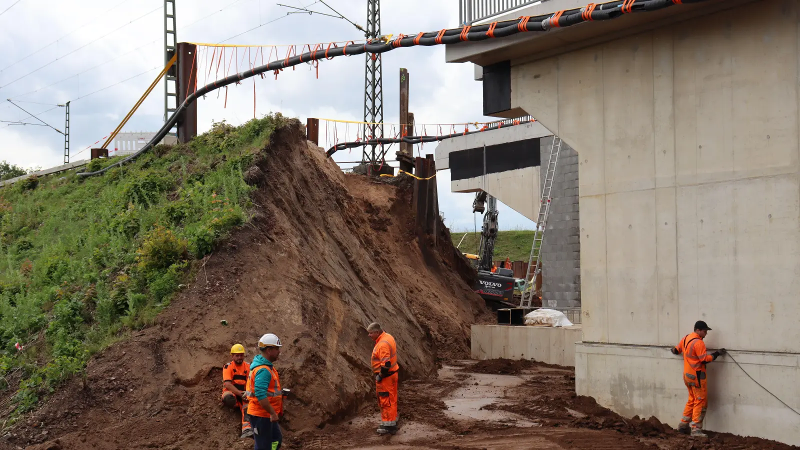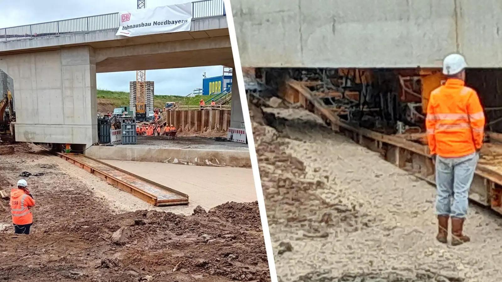 Auch das konnte Rudolf Eger beobachten: Beim Verdichten mit einer Rüttelmaschine seien Teile des Bahndamms instabil geworden. Ein Erdrutsch erfasste einen danebenstehenden Bagger. Dessen Fahrer habe gerade die Tür offen gehabt, sonst wäre er in der Maschine von den Massen eingeschlossen worden. Bilder zeigen den halb verschütteten Bagger. Und das sei noch Glück gewesen, sagt Eger. „Wäre der Bagger da nicht gestanden, hätte es die Arbeiter erwischt, die dahinter die Erde verdichtet haben.“