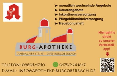 unsere rund 4.000 Einwohner zählende Gemeinde im westlichen Mittelfranken liegt in der Mitte zwischen der Regierungshauptstadt Ansbach und dem fränkischen Seenland, das Naherholungsgebiet im nordbayerischen Raum. Die sehr gute Verkehrsanbindung zur Autobahn (A6), zur Metropolregion Nürnberg, zu den Hochschulstandorten Ansbach und Triesdorf, zum Bahnhof in Ansbach usw. stellt Burgoberbach als einen attraktiven Standort für Gewerbe genauso wie für Einwohner und Besucher dar.