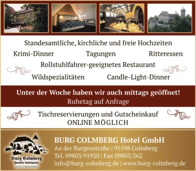 Die Colmberger Vereine verwöhnen Sie an beiden Tagen in gewohnter Weise mit ihren kulinarischen Leckereien und Besonderheiten in ihren Verkaufsständen. Diese fränkischen Spezialitäten, alle selbst und mit Liebe zubereitet, und das in Franken gebraute Bier sowie Kaffee und Kuchen sind wahre Gaumenfreuden. Dazu ein Plausch mit Bekannten und Freunden, gute Unterhaltung umrahmt von angenehmer Unterhaltungsmusik, lassen Ihnen die Tage und Stunden in Kurzweil vergehen.