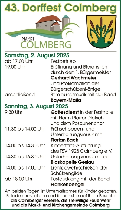herzlich willkommen zu unserem 43. Dorffest in Colmberg am 2. und 3. August 2025.