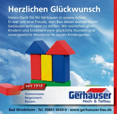 Am 8. Mai 2026 findet ab 15 Uhr eine große Einweihungsfeier mit einem Tag der offenen Tür statt. Hierfür werden nicht nur alle am Bau beteiligten Gewerke eingeladen, sondern auch alle Interessierten aus der Gemeinde und der Umgebung. Im Rahmen der Einweihung wird es einen feierlichen Gottesdienst geben. Im Anschluss werden dann der neue Name der Einrichtung und das neue Logo bekannt gegeben. Und auch die sechs Krippen- und Kindergartengruppen erhalten neue Namen. Man darf gespannt sein.