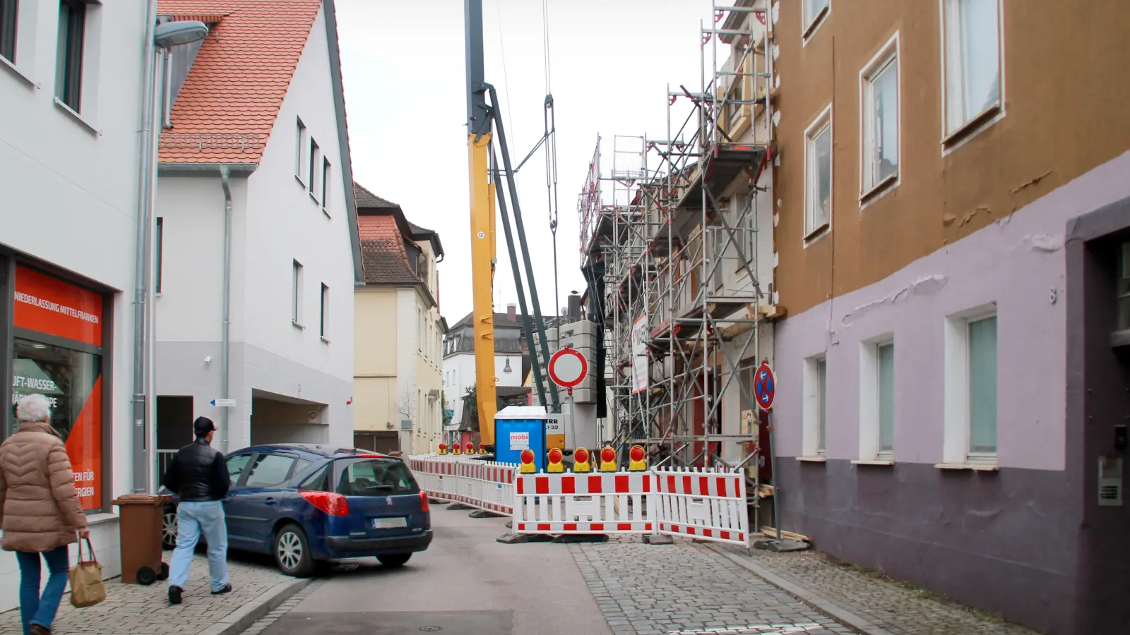 Eine Vollsperrung der Alten Poststraße ist bis auf Weiteres nicht nötig. Das sind gute Nachrichten für die Nutzer einer gegenüberliegenden Tiefgarage (links). (Foto: Alina Boger)
