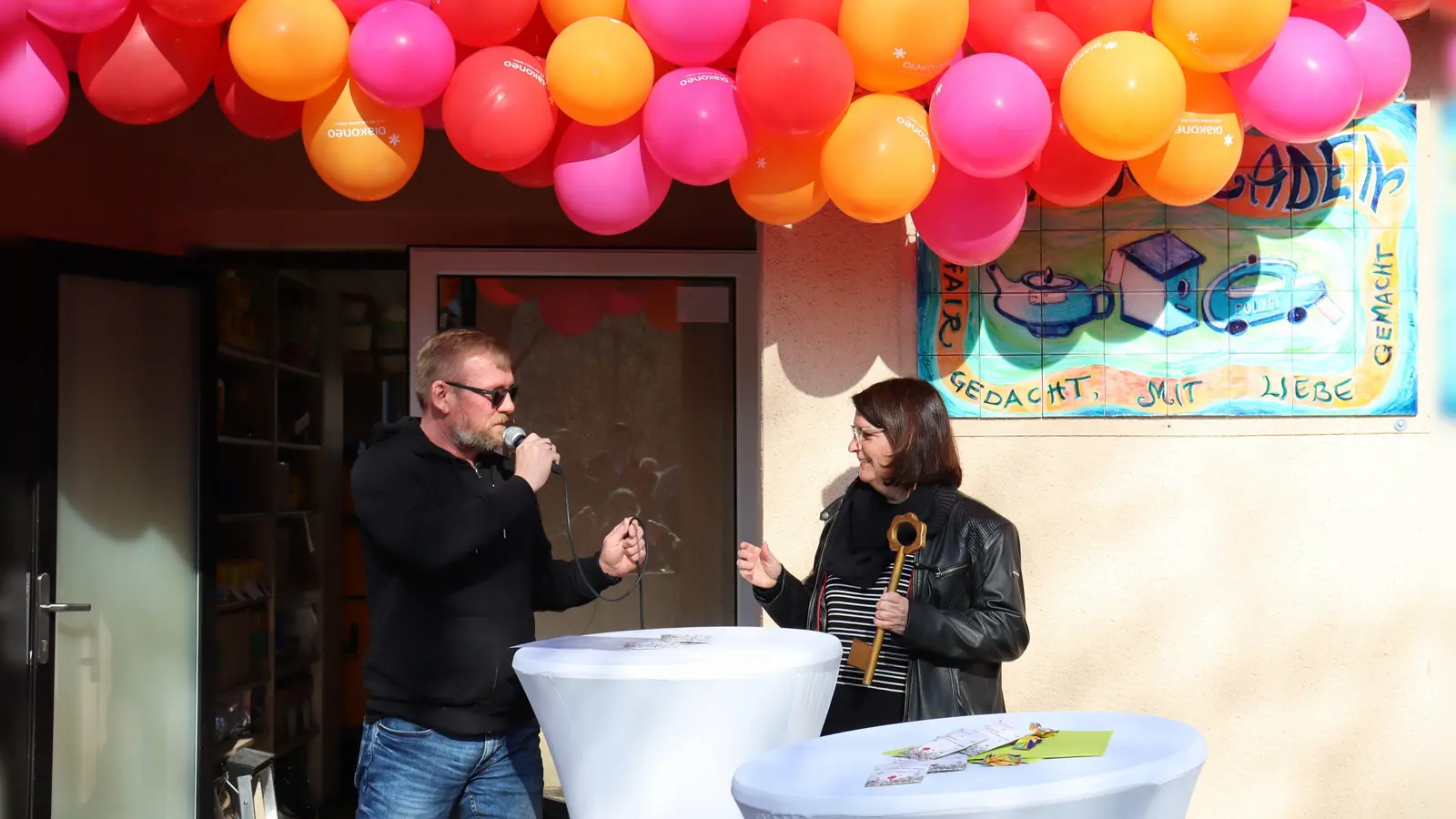 Eine pralle, pink-orangene Luftballonkette baumelt über der Eingangstür, aus dem Fenster spitzeln Holz-Häschen und vor der Türe in der Schloßstraße 1a versammeln sich zahlreiche Menschen: Bei strahlendem Sonnenschein wurde an diesem Freitag der neue Schlossladen in Bruckberg eröffnet.