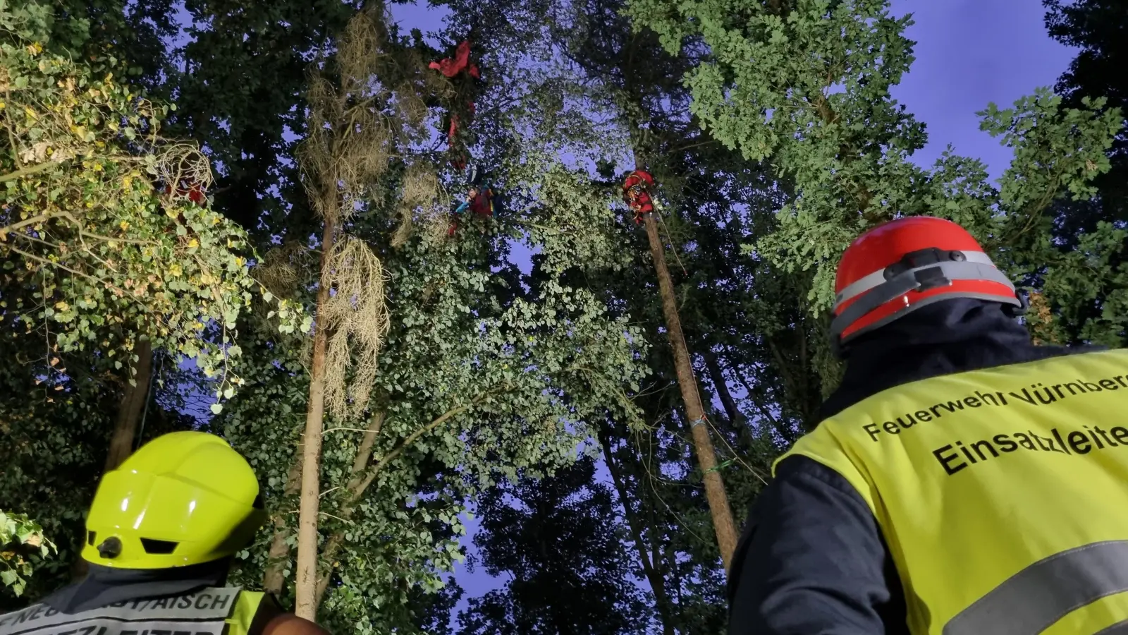 Nachdem die Höhenrettungsgruppe mit neun Berufsfeuerwehrleuten aus Nürnberg eingetroffen war, bestiegen zwei Höhenretter mit Steigeisen zwei Bäume neben dem Fallschirmspringer. Dort errichteten sie zwei Festpunkte über der Absturzstelle. „Anschließend wurde der Fallschirmspringer über diese Festpunkte gesichert und die Verbindung zu seinem Fallschirm gelöst“, beschreibt Rainer Weiskirchen die entscheidenden Moment. Dann konnte der 40-Jährige sicher abgelassen werden.