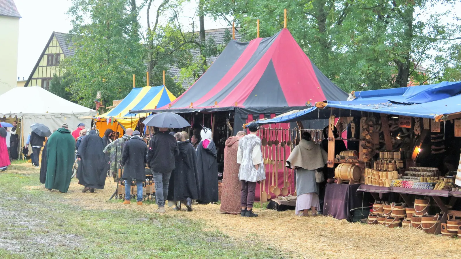 Zum zehnten Mal steigt in Feuchtwangen (Landkreis Ansbach) das Mittelalterspektakel. Sogar ein Drache treibt sein Unwesen. Und auf dem Mittelaltermarkt präsentieren etwa 120 Schausteller Sehenswertes und Leckeres. Sie lassen sich auch vom Regen nicht beirren. Wir haben die schönsten Momente mit der Kamera eingefangen.