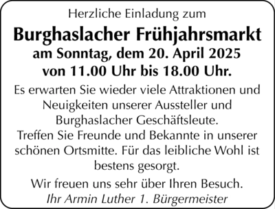 Burghaslach lädt ein zum traditionellen Frühjahrsmarkt am Ostersonntag, 20. April 2025. Zahlreiche Fieranten und Aussteller präsentieren ihre Schätze am Kirchplatz und animieren Besucher, das vielfältige Warenangebot zu entdecken und die tollen Attraktionen zu genießen.