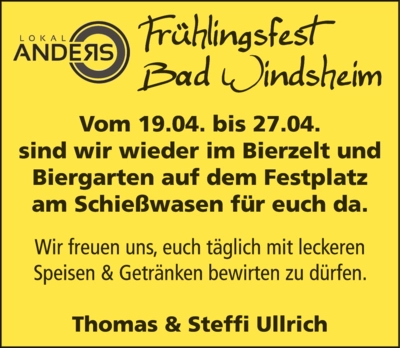 Das 68. Bad Windsheimer Frühlingsfest mit seinem vielfältigen Unterhaltungsprogramm für Jung und Alt ist der Auftakt der Festsaison in Bad Windsheim. Mit seinen zahlreichen Angeboten sowohl auf dem Festplatz Schießwasen vor den Toren der Stadt als auch in der historischen Altstadt ist das Fest seit Jahren ein Anziehungspunkt für Familien, für Besucher aus dem Umland und Gäste Bad Windsheims.