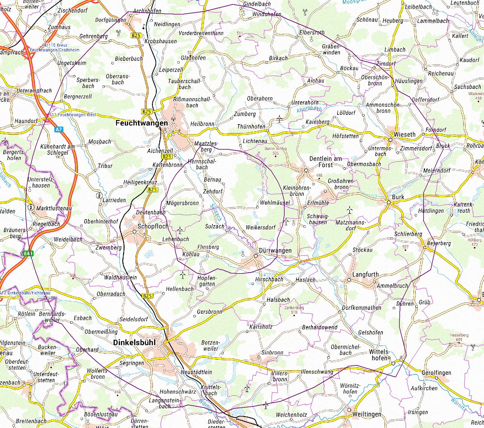 Innerhalb des Zehn-Kilometer-Radius' der Überwachungszone liegen im Landkreis Ansbach folgende Orte: