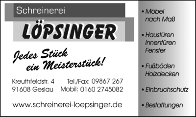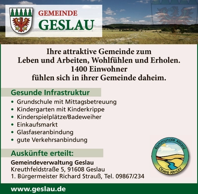 „Sobald du die schönen Dinge in deinem Leben wahrnimmst, gehst du mit einem Lächeln durch dein Leben.” Mit diesem Zitat von Nicole Engelhardt-Credo darf ich Sie ganz herzlich einladen mit mir eine Reise zu unternehmen und die schönen Dinge im Leben zu entdecken. Die Reise führt uns an die Obere Altmühl, ganz in die Nähe des Ursprungs der Altmühl. An einem Zufluss gelegen, finden wir die Gemeinde Geslau. Die ca. 1400 Einwohner unserer Gemeinde verteilen sich neben dem Hauptort Geslau auf weitere 13 Ortsteile.