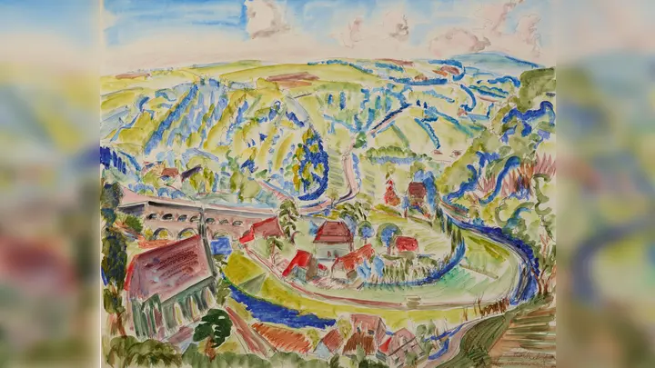 Laien, die vor dem Werk stehen, nehmen erst einmal viele Farben wahr. Das Aquarell wirkt einladend, froh – und zeigt den Blick hinunter ins Tal auf die Doppelbrücke und die Kobolzeller Kirche.Experten haben natürlich einen anderen Blick auf das Aquarell des Expressionisten und Mitbegründers der Künstlergemeinschaft „Die Brücke“ Erich Heckel aus dem Jahr 1927. Experten sehen Feinheiten, besondere Techniken. Anja Bergermann, als Kunsthistorikerin eine absolute Fachfrau, erklärt: Es handelt sich um ein Aquarell „über Bleistift auf Papier“, es ist 56 mal 68 Zentimeter groß, betitelt mit „Im Taubertal“.