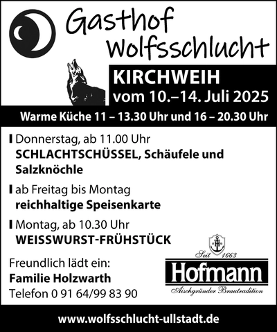 Am Wochenende vom 10. Juli bis 14. Juli heißt es wieder „Kerwa is“ im Sugenheimer Gemeindeteil Ullstadt. Für das leibliche Wohl sorgt der Gasthof Wolfsschlucht täglich zu den gewohnten Öffnungszeiten.