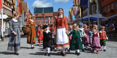 9 Uhr: Großer Kinderfestzug mit der Dinkelsbühler Knabenkapelle, dem Knabenbataillon, der Zunfttanzgruppe und historischen Kindergruppen