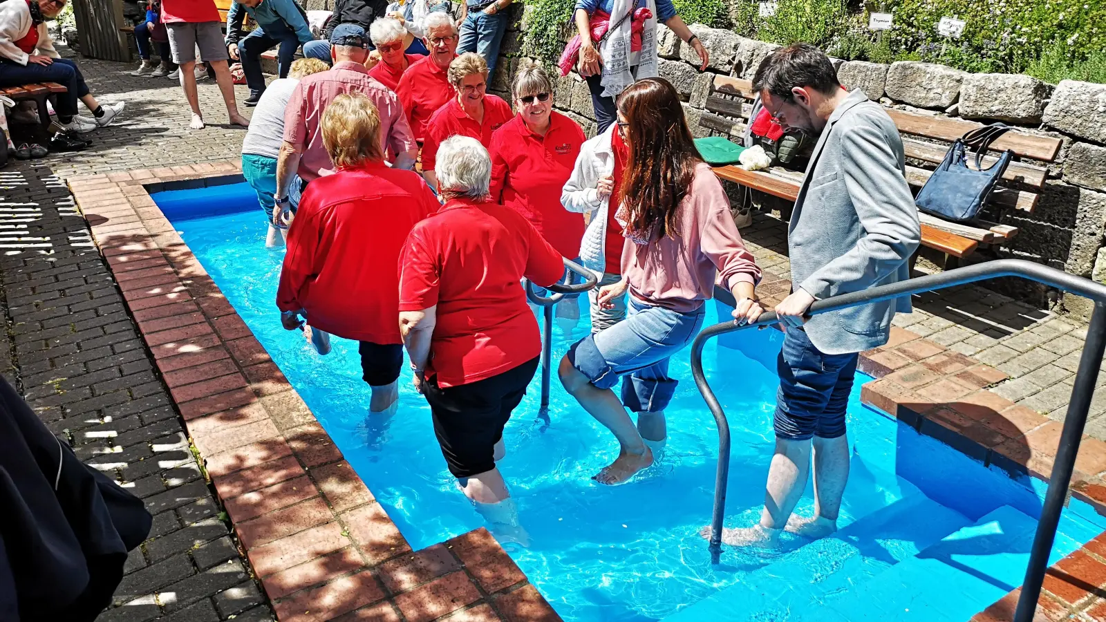Die Kneippanlage unterhalb des Kriminalmuseums ist gut durch den Winter gekommen und dient nun wieder ihrem Hauptzweck. Zum entspannten Saisonstart fanden sich am Samstag einige Dutzend Leute ein und wagten auch gleich ein paar Storchengänge im noch recht kühlen Nass.
