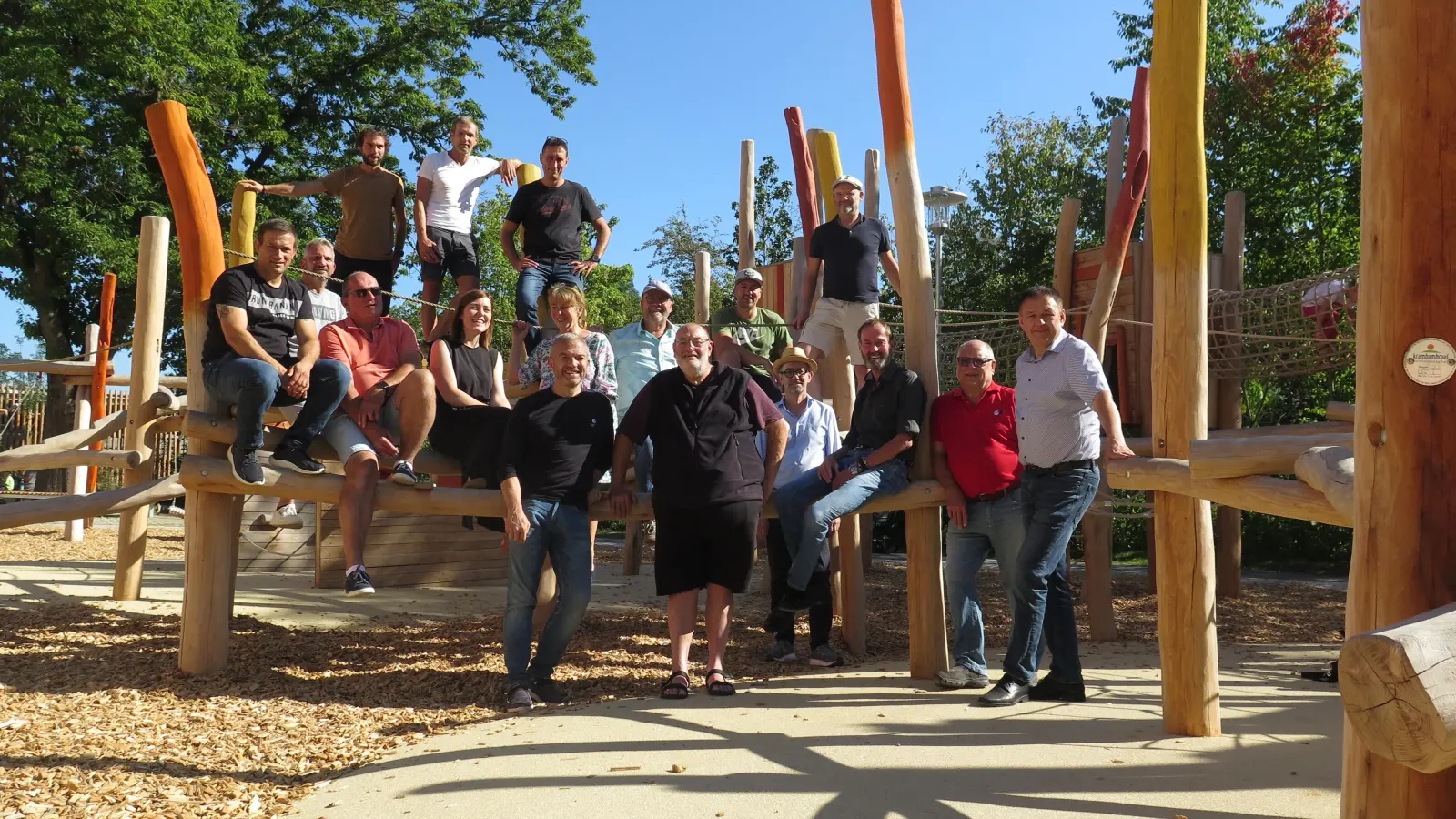 Die Stadtverwaltung Dinkelsbühl um OB Dr. Christoph Hammer (Dritter von rechts) hat gemeinsam mit Stadträten und Projektbeteiligten die erste Belastungsprobe für das Klettergerüst vorgenommen. (Foto: Alexander Schäffer)