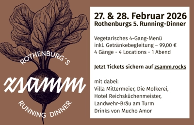 Ran an die Karten für das Running-Dinner von zsamm: Am 27. Februar und 28. Februar 2026 führt das Event kulinarisch in vier Gängen durch vier Locations in Rothenburg ob der Tauber: Landwehrbräu Am Turm, Molkerei, Reichsküchenmeister und Villa Mittermeier heißen die vier Stationen.