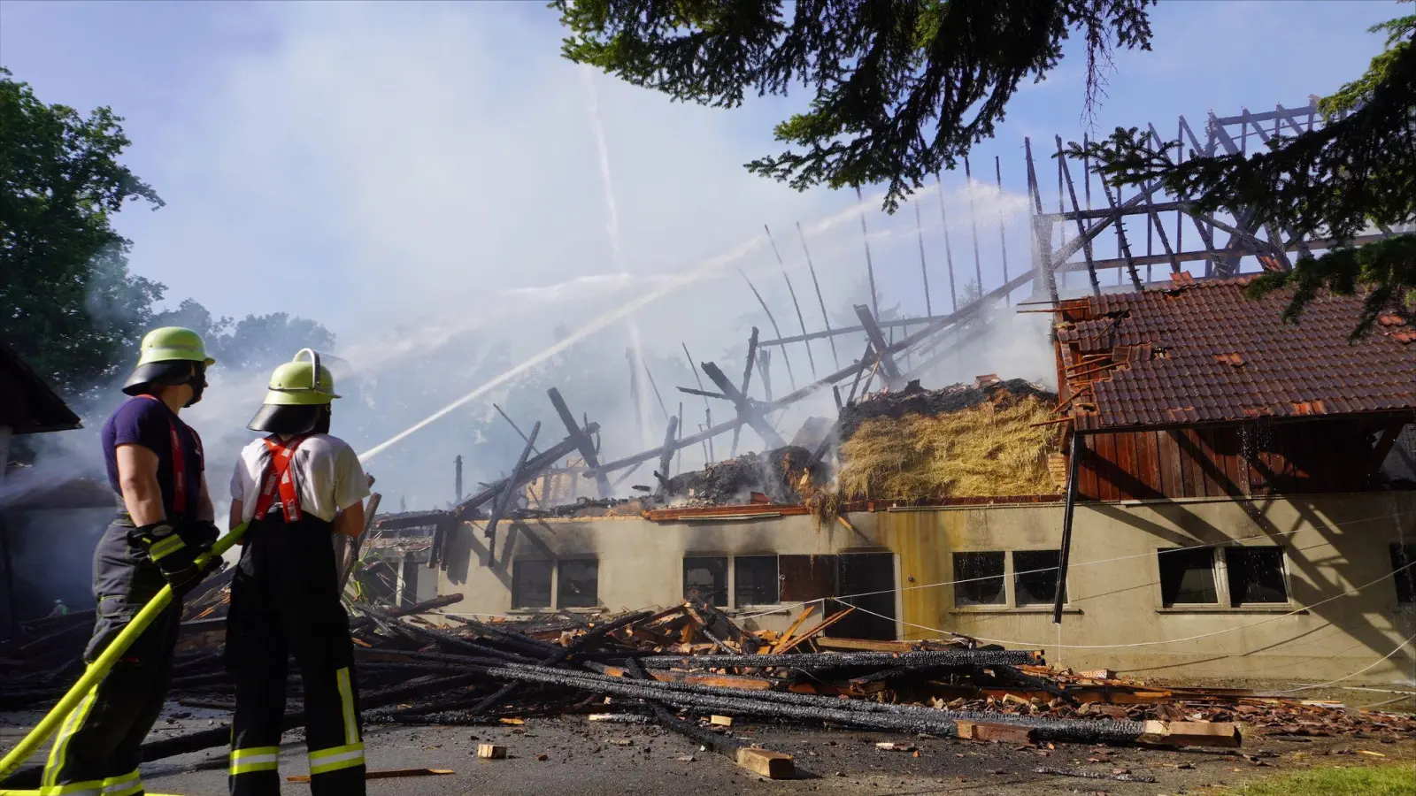 Der Stall brannte den Angaben zufolge vollständig aus und stürzte zusammen. Teilweise stünden nur noch die Grundmauern, erklärte der Sprecher. Verletzte gebe es nach ersten Erkenntnissen nicht. Alle Menschen konnten das Gebäude demnach rechtzeitig verlassen.