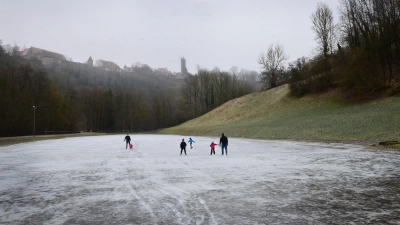 Die Eiswiese im Taubertal ist derzeit gefroren und lud am Wochenende zu einer Runde Eissport ein. Bei einigen kamen nostalgische Gefühle auf.