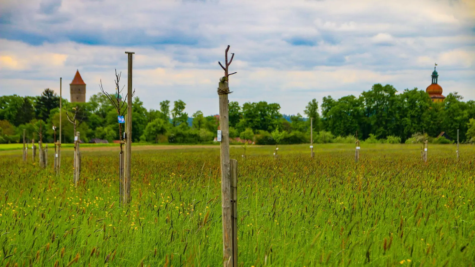 Während in der Natur derzeit alles üppig grünt und die Obstbäume in voller Blüte stehen, sieht es auf der Streuobstwiese an der Kreisstraße 45 zwischen dem Ellwanger Kreisel und der Einmündung in die Nordwesttangente trist aus: Die jungen Obstbäume stehen verkümmert in der kniehohen Wiese.